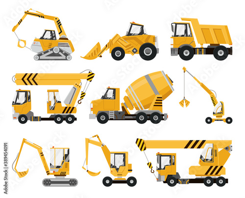Big set of construction equipment. Special machines for the construction work. Forklifts, cranes, excavators, tractors, bulldozers, trucks. Special equipment. Road repair. Commercial Vehicles.