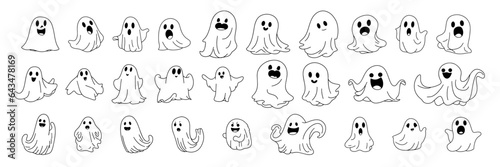 Big set of hand drawn doodle ghosts. Halloween ghost silhouette set, Outline ghost collection. Vector illustration. Line art ghost