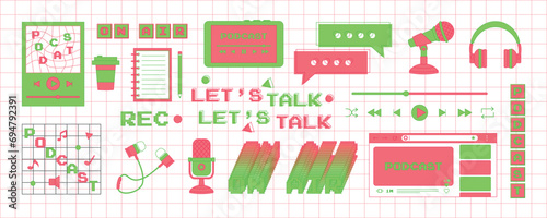 Big set of podcast stickers in the trendy y2k style. Old computer aesthetics from the 90s, 00s. Retro PC elements, user interface. Vector illustration