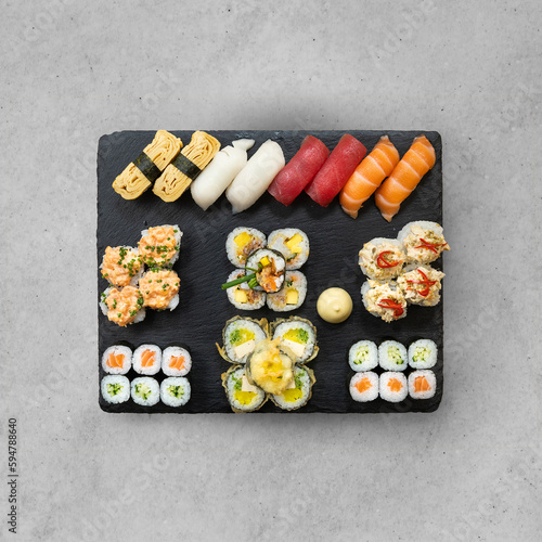 Big set of sushi and maki rolls on special black plate at grey stone table