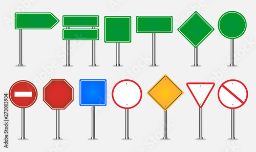 Big set of traffic signs. Road board text panel, mockup signage direction of highway, city, signpost, location, street arrow, way set is presented.