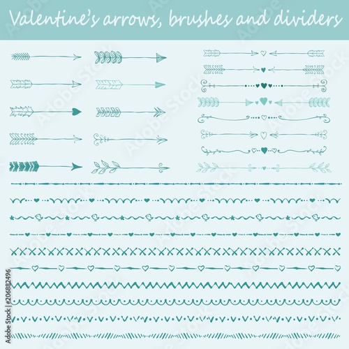Big set of Valentine's hand drawn brushes,arrows and text dividers for design of greeting cards