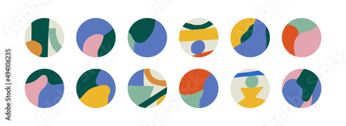 Big set with round patterns. Abstract and geometric shapes. Can be used as social media covers, highlights, icons or stickers. Simple style in modern colors. Hand drawn vector illustration.