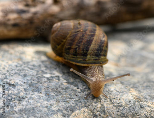 Big snail in shell crawling on road 2