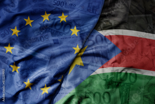 big waving realistic national colorful flag of european union and national flag of south sudan on a euro money banknotes background.