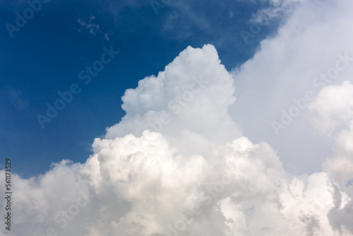 Big White fluffy cumulonimbus storm clouds in deep blue sky