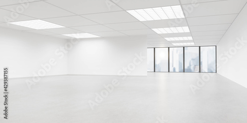 big white office loft room interior with panoramic window with city view 3d render illustration