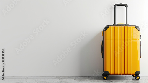 big yellow travel suitcase, object with shadow on white background with empty copy space_