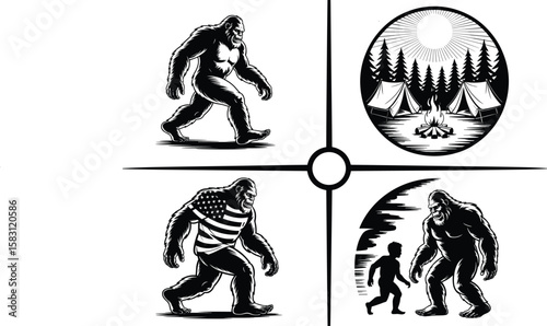 Bigfoot Silhouette Vector in Forest Landscape, Sasquatch Clipart Design – Mythical Creature Illustration, Forest Monster Bigfoot SVG – Outdoor Adventure Design, Retro Bigfoot Design – Mountain Camping