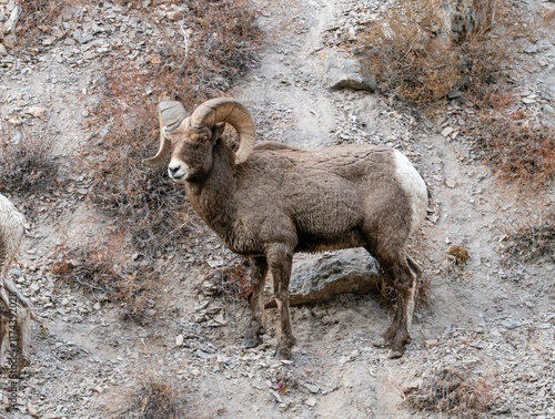bighorn ram with gnarley horns in profile on rocky shale slope.