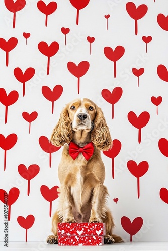 Biglietto di auguri con un Cocker Spaniel circondato da cuoricini rossi, vicino ad un pacchetto regalo