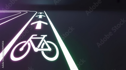 Bike Lane Sign on Road: A neon-illuminated bike lane marking, clearly visible against the dark asphalt, indicates the designated route for cyclists.
