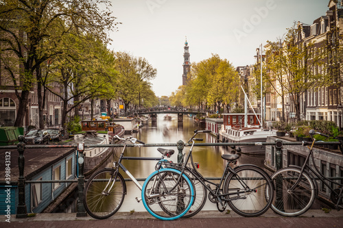Bike over canal Amsterdam city. Picturesque town landscape in Netherlands with view on river Amstel