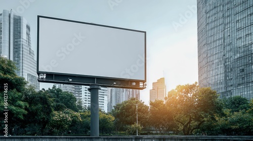 Billboard Mockup in Urban Environment with Skyscrapers, Ready for Advertisement Placement and Marketing Campaigns