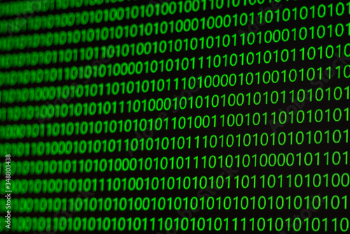 Binary numbers, zeros and ones, in green on a black computer monitor