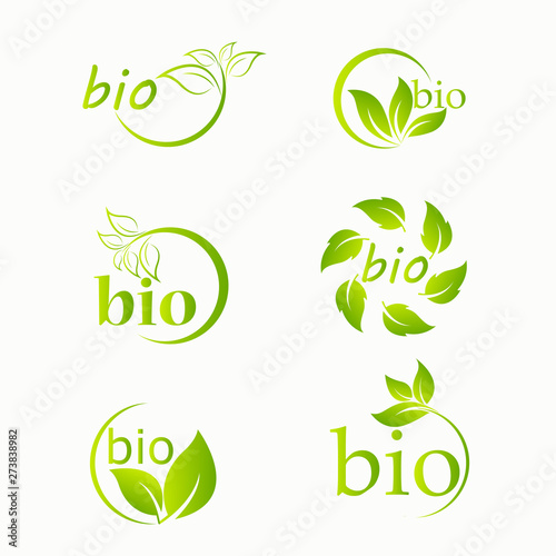 Bio Product, doodle organic leaves emblems, stickers, frames and logo