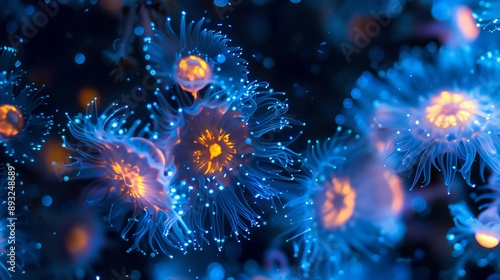 Bioluminescent Algae Macro of glowing algae, each cell a detailed burst of natural light, deep sea inspiration