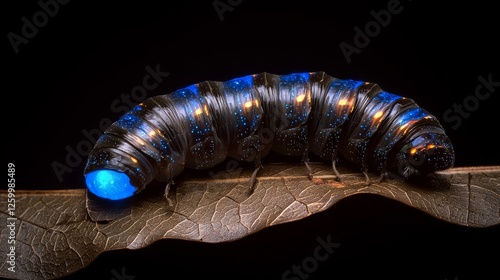 Bioluminescent Caterpillar Illuminates Leaf at Night Nature Image Macro Photography Dark Environment Close-up View Unique Phenomenon
