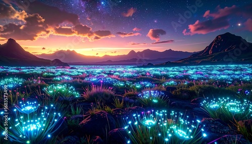 Bioluminescent fields stretching to the horizon, glowing flora illuminating strange terrain under radiant otherworldly skies.