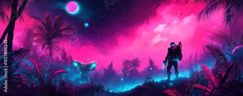 Bioluminescent forest with explorer, neon-lit sky, alien wildlife