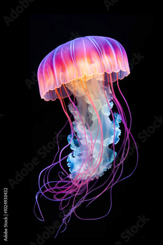 Bioluminescent jellyfish on black background. Pink and purple toned digital illustration.