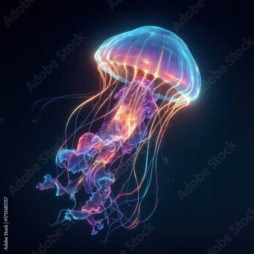 Bioluminescent Jellyfish Pulsating with Vibrant Neon Colors in Deep Ocean Darkness.