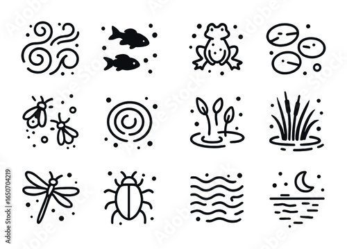 Bioluminescent River Icons. Outline icon set of bioluminescent rivers: glowing algae swirls, fish silhouettes,