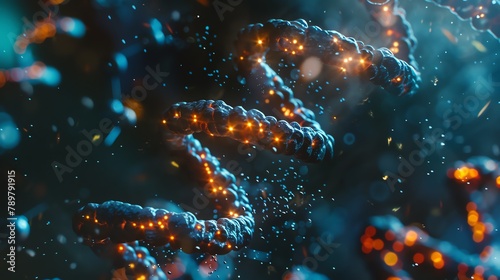 Biomedical research in genetics and drug development, closeup on genetic sequencing, molecule model