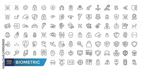 Biometric Related Line Icons Set. Related to Voice Recognition, Fingerprint, Door Lock and more. Collection and pack of linear web and ui icons. Editable stroke. Vector illustration.