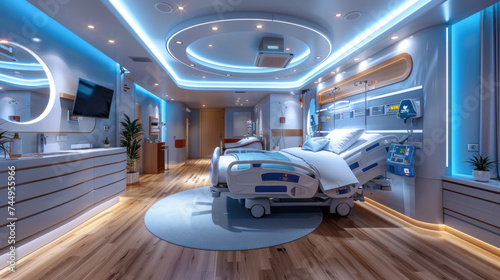Biometrics, recovery ICU intensive care unit room ward with life support at hospital medical care emergency.