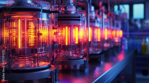Bioreactor array in a futuristic lab, glowing with LED lights, conducting biofuel research, biotechnology concept, Advance Bioreactors Laboratory