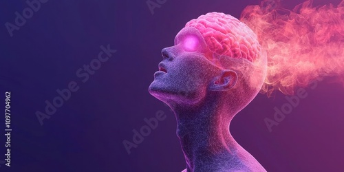 Biotechnology biopharma healthcare concept. A surreal depiction of a person with a glowing brain, emitting colorful smoke, symbolizing creativity and imagination.