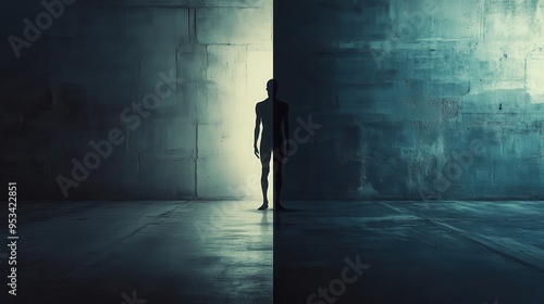 Bipolar disorder visualized as a person split into light and dark halves, each pulling in opposite directions (close up, duality of mind, surreal, Silhouette, empty warehouse backdrop)