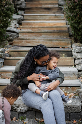 Biracial mom cuddling laughing toddler son on steps in backyard in autumn