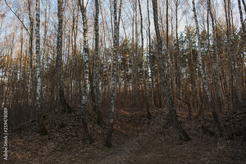 Birch tree grove in spring. The road in the birch grove spring, the path in the forest among the birches. birch grove and rural road.