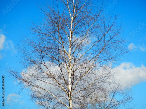 Birch tree with branches without leaves during winter time and blue sky with white clouds. Topics: natural environment, vegetation, season, deciduous tree, nature