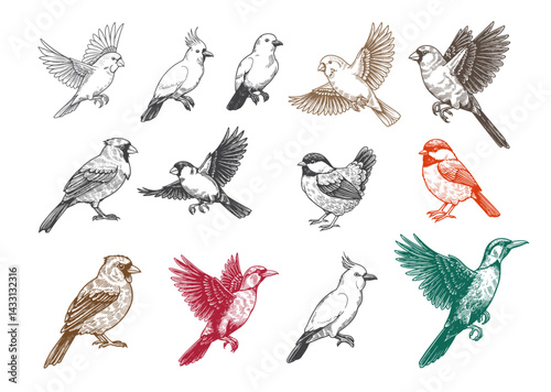 bird collection, illustration, drawing, engraving, ink, line art, vector. animal engraving illustration