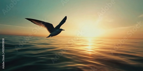 Bird Flying Over Ocean Sunset