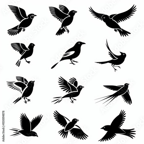 Bird icon set, black and white sparrow symbols, bird sign collection, wild animal pictograms on white