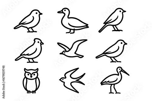 Bird icon set vector collection. Line art animal outline symbols for logo design. Wildlife and nature graphic elements. Includes duck, owl, swallow, stork. Simple pictogram.