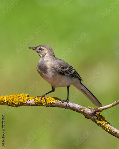 Bird juvenile White wagtail Motacilla alba small bird with long tail on light blurred background, Poland Europe