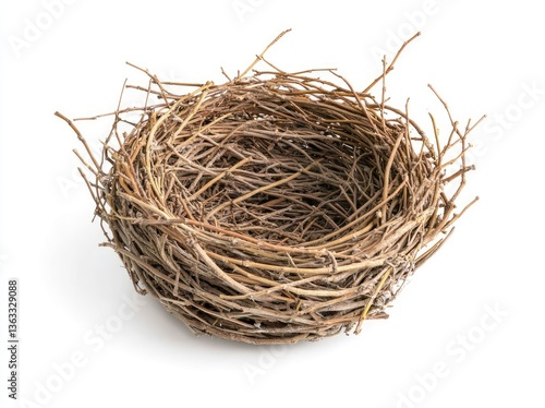 Bird Nest Woven with Twigs on White Background for Spring Imagery