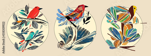 Bird on tree branch with leaves, flowers and large circle on light beige background. Colorful illustration.