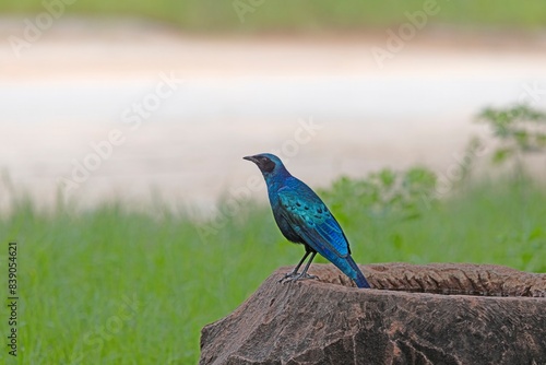 Bird portrait of a blue bird sitting on a tree trunk with a green meadow in the background