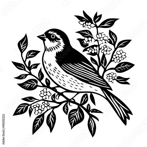 Bird silhouette on a branch with floral elements woodcut style birds logo design