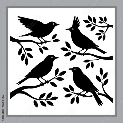 Bird Silhouettes on Branches Graphic Art Illustration of Wildlife in Nature Scenery for Home Decor and Crafts