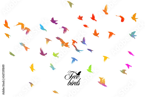 Bird watercolor. A flock of colorful birds. Mixed media. Vector illustration