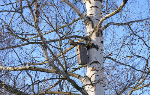 Birdhouse on a birch tree.