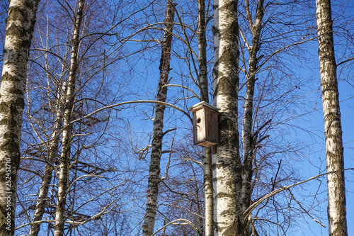 Birdhouse on a birch tree in winter forest.