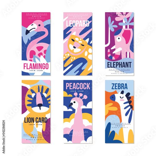 Birds and Animal Poster and Cards with Lion, Peacock, Zebra, Elephant, Leopard and Flamingo Vector Set
